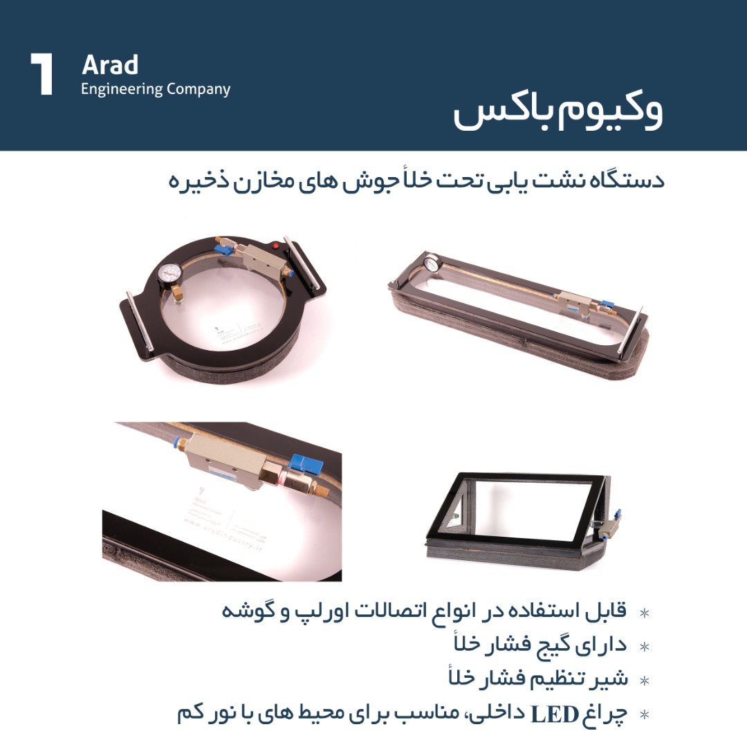 در راستای تأمین نیازهای دپارتمان بازرسی شرکت فنی مهندسی آراد، طراحی و ساخت انواع دستگاه نشت یابی تحت خلاء انجام گردید. این دستگاه ها در سه نوع تخت، گوشه و گرد ساخته شده اند که به ترتیب برای انجام تست نشت یابی تحت خلاء بر روی جوش های Overlap، اتصالات گوشه (Corner) و نیز محل تقاطع دو اتصال Overlap مخازن ذخیره قابل استفاده هستند.