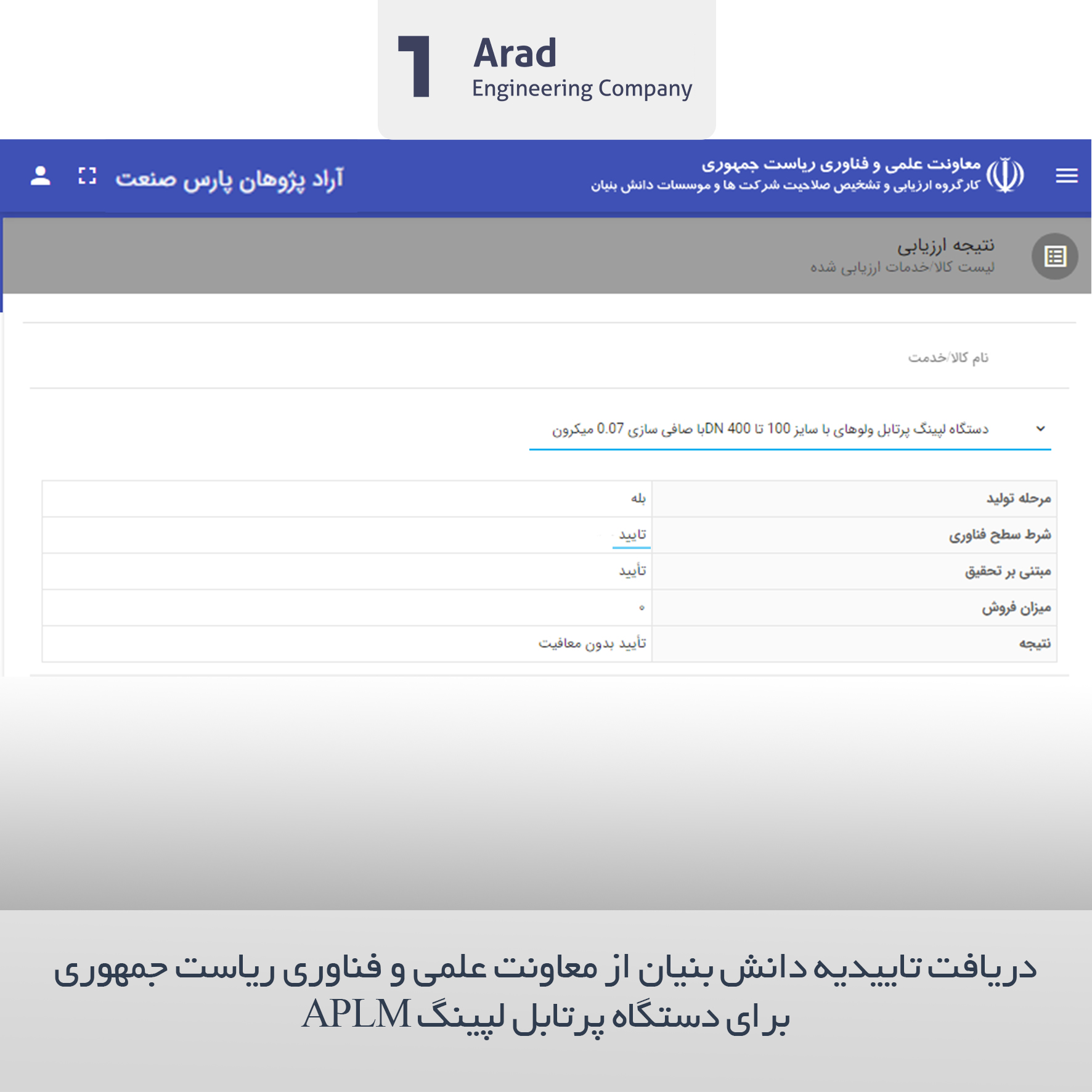 دریافت گواهی دانش بنیان / 25 May 2022 / 0 Comments شرکت آراد با طراحی و ساخت دستگاه لپینگ مورد استفاده در صنایع نفتی و نیروگاهی موفق به اخذ گواهی دانش بنیان شد. برچسبها دستگاه لپینگ، دانش بنیان، Lapping valve repair aplm